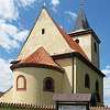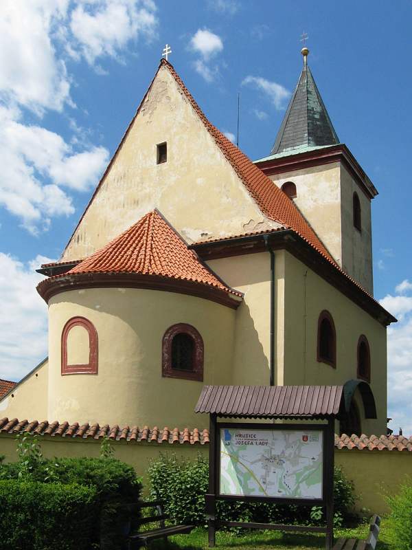 Hrusický kostel můžeme v různých podobách vidět na mnoha obrazech a ilustracích zdejšího rodáka Josefa Lady.