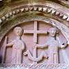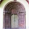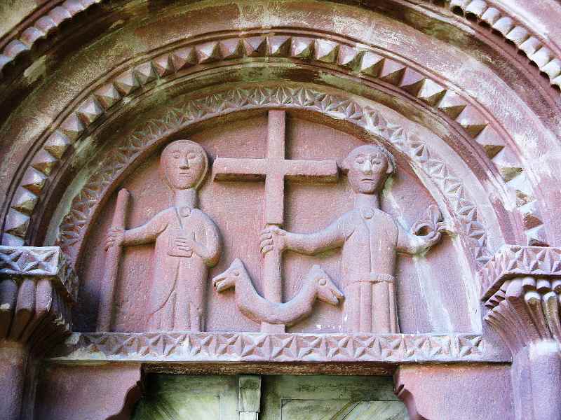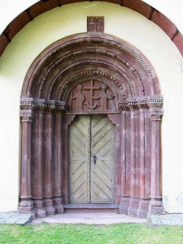 Z doby založení kostela se zachoval románský ústupkový portál, který je nejcennější částí stavby. V době pozdějších úprav byl sice zazděn, ale v roce 1853 opět odhalen (na www stránkách obce Hrusice se uvádí, že k jeho znovuobjevení došlo náhodou, když do kostelní věže uhodil blesk a stěna kostela praskla). Na tympanonu portálu jsou zobrazeny dvě primitivně pojaté postavy, snad představují buď sv. Cyrila a Metoděje, nebo sv. Václava a sv. Vojtěcha. Portál je vytesán z červeného pískovce a pravděpodobně je dílem mnichů z kláštera sv.Prokopa v Sázavě.