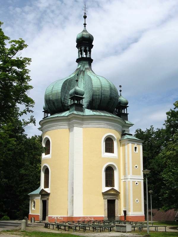 Centrální kaple má kruhový půdorys proťatý čtvercem, k její severní stěně přiléhá sakristie stejného půdorysu, ta slouží zároveň i jako malá postranní loď. Stěny kaple jsou konkávně vypuklé, vně jsou v pravoúhlých nárožích vložené pilastry. Ze všech čtyř stran se nacházejí vchody s kamennými portály, zakončenými trojbokým tympanonem. Kaple je zaklenuta kopulí, do které jsou vykrojeny lunety nad okny a výseče nad kouty. Stavba je zakončena barokně rozčleněnou oplechovanou cibulovitou věží s lucernou, završenou španělským křížem. Při patě cibulové věže, nad výdutěmi, se nacházejí malé věžičky/lucerničky s cibulovou bání. Věž je vysoká 31 metrů.