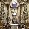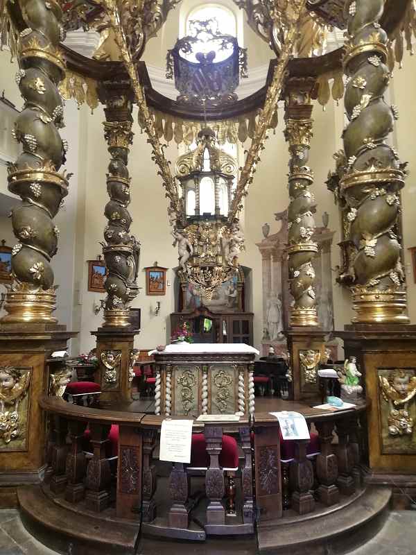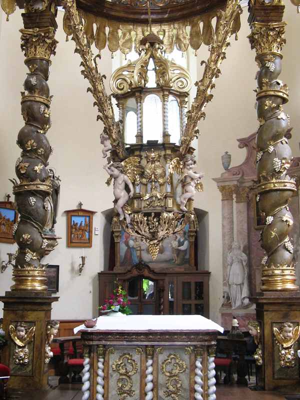 Unikátní je centrální oltář baldachýnového typu s bohatými řezbami, který je zmenšenou napodobeninou Berniniho papežského oltáře z baziliky sv. Petra v Římě. V horní části oltáře je zavěšen svatostánek v podobě lucerny, při svěcení chrámu do něj byla uložena soška Panny Marie. Hlavní oltář byl zhotoven za jeden rok a pozlacen po pěti letech. Jeho autorem je řezbář Jan Wauscher z Lince. Kazatelna je rokoková, zdobená řezanými figurálními reliéfy, na votivním obrázku z roku 1722 je vymalována legenda o založení kostela.
